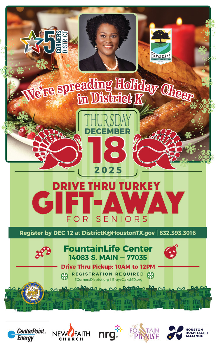 HHA is partnering with District K and Mayor Pro Tem Castex-Tatum's Annual Turkey Gift-Away. HHA members are invited to volunteer to help pass out turkeys at the FountainLife Center on December 18th from 8:30 - 12:30 pm. District K Share A Holiday Meal Turkey Gift-Away Thursday, December 18 8:30am - 12:30pm FountainLife Center 14083 S. Main St. Houston, TX 77035